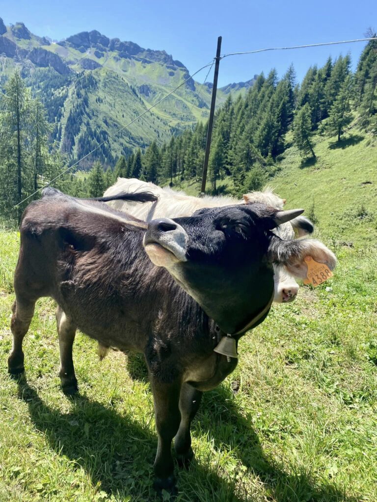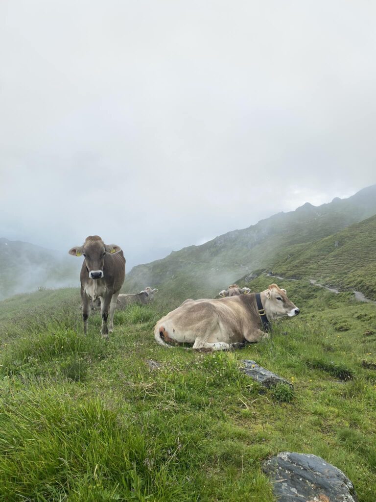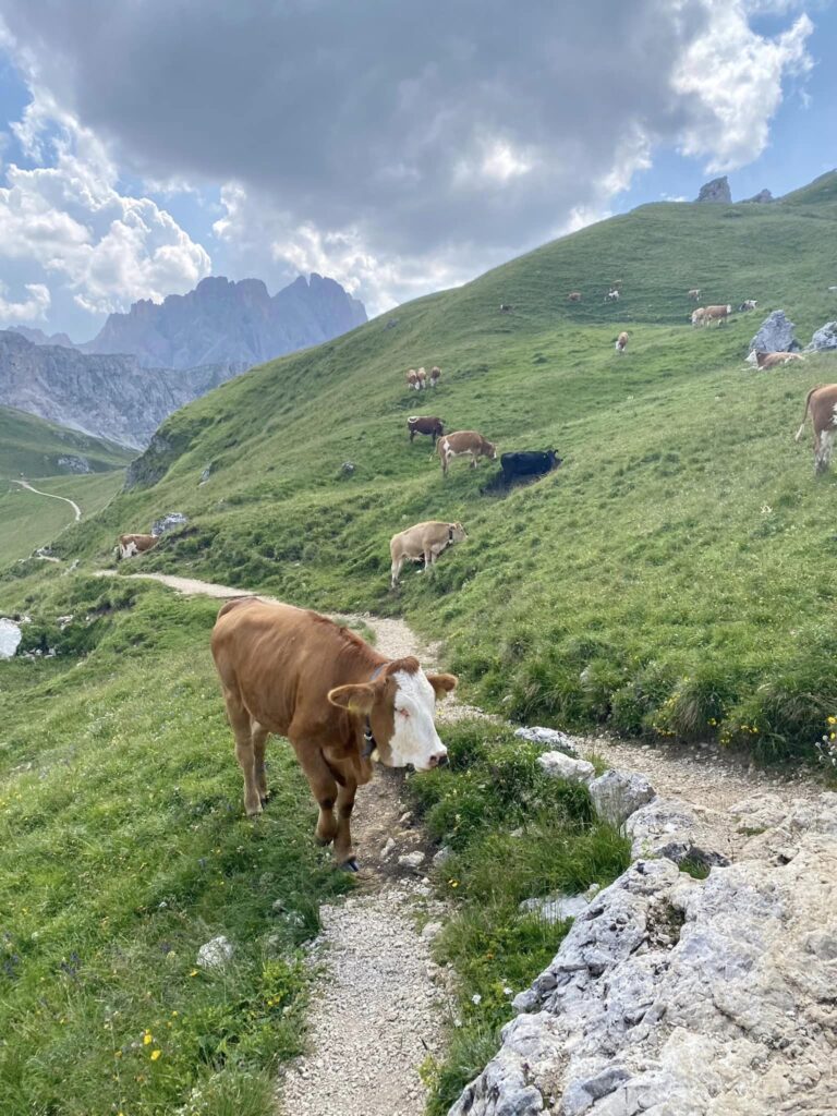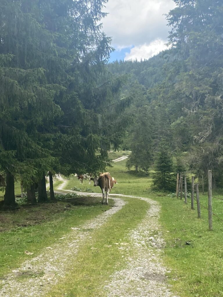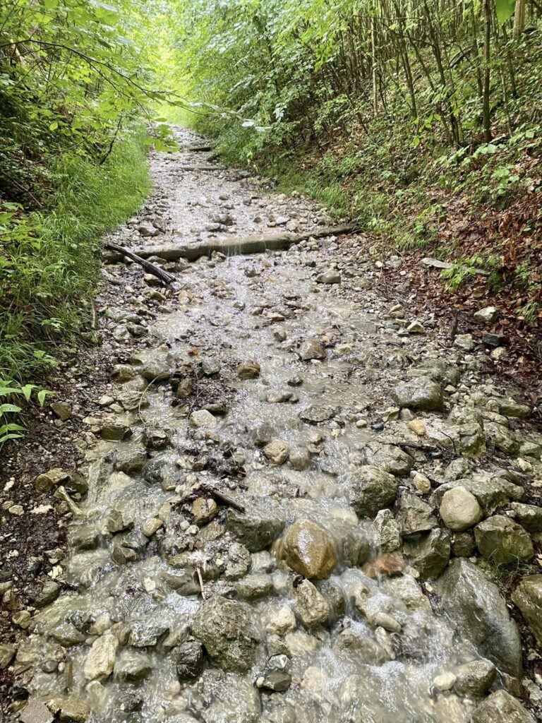 Myslela jsem, že dneska konečně dojdu celý den v suchých botách, ale při vyhýbání kravám jsem šlápla asi 20 cm hluboko do jejich bahenních lázních, tak třeba zítra. V jednu chvíli jsem začala potřebovat na velkou, chtěla jsem to rozchodit, protože se mi nechtělo zastavovat, za chvíli bylo fakt za pět 12, takže rychle za strom, hůlky na zem, batoh na zem…když je hotovo, zjistím, že ta jedna hůlka to bohužel odnesla, takže jsem ji šla poctivě umýt do potoka. Nevím, co si o těch kravách mám tady myslet, vypadají vyloženě konfliktně, technika na setkání se žralokem-tedy dívat se mu do očí, je u skotu značně nefunkční, jelikož to berou jako pokyn: jdeme za tebou a s tebou.