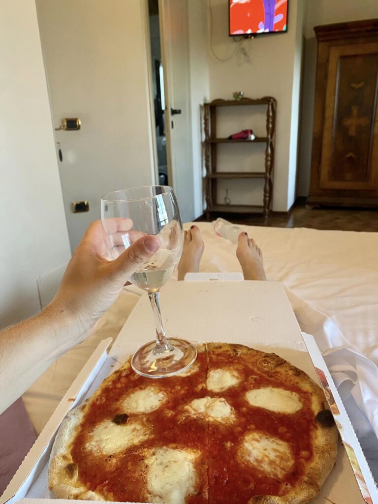 Pak jsem teda šlapala až do večera, lehce se u toho rozčilovala, jelikož ty neexistující trasy mě serou. Jednou najednou skončí cesta, podruhé se ta cesta rozdělí na tři a já zkouším, kterou se mám vydat…posledních 10 km chůze v pangejtu u rychlostní silnice byla jen třešinka na dortu. Vyřízená jsem se dokodrcala do hotelu a tam na mě čekala úžasná paní. Na stole proseco, voda, buchty a k objednání pizza…děkuju, že mi zas někdo připomněl, že jsem vlastně na dovolený.